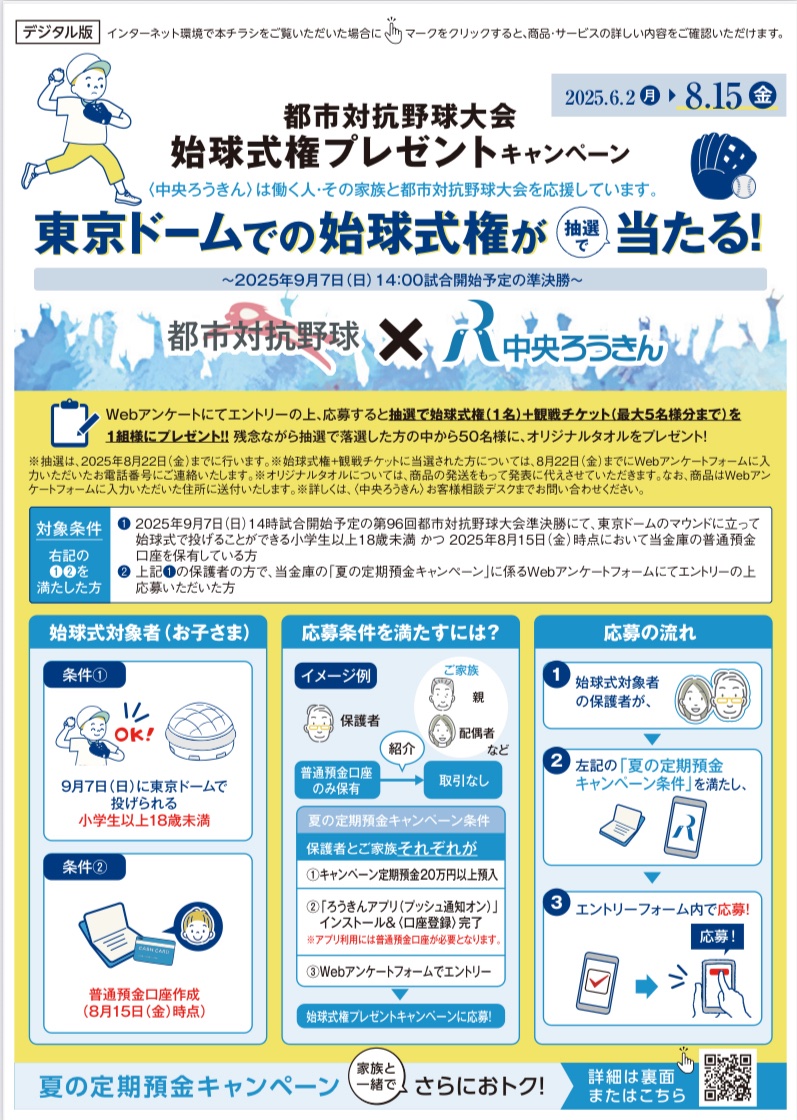 〈中央ろうきん〉では、東京ドームでの始球式権が抽選で当たるキャンペーンを実施しています⚾️✨