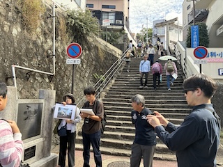 有名な平和祈念像が設置された時に指摘された疑念、中国のモニュメントのみ鉄柵で囲われている経緯、浦上天主堂が保存されず解体されてしまった理由などを伺い、一味違ったフィールドワークを味わいました。